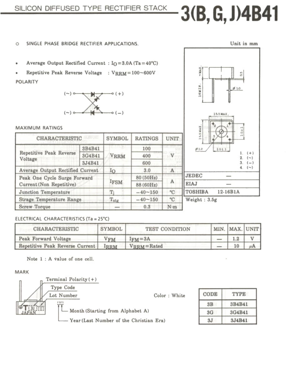 the 3J4B41 is a silicon bridge rectifier, U = 600V, I = 3A, applications: rectifier