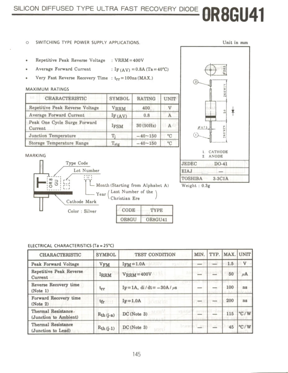 0R8GU41 è un diodo silicio, U = 400V, I = 800mA, d´application: aalimentatori a commutazione