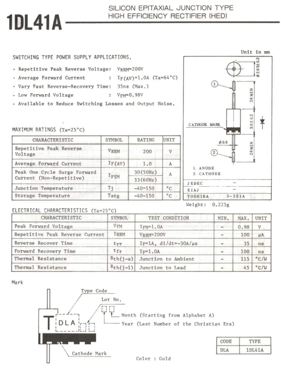 1DL41A è un diodo silicio, U = 200V, I = 1A, d´application: aalimentatori a commutazione