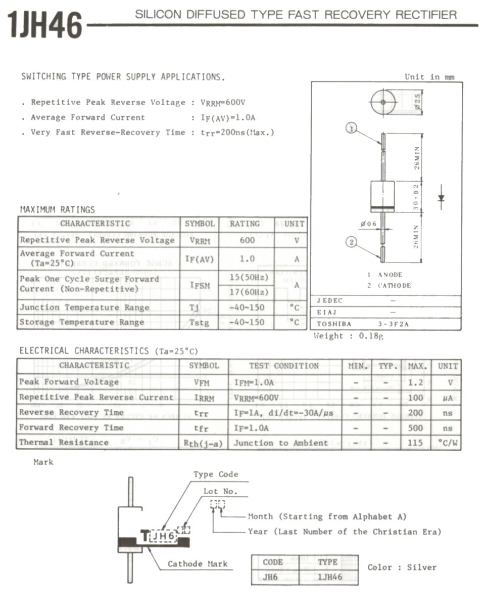 the 1JH46 is a silicon diode, U = 600V, I = 1A, applications: SMPS