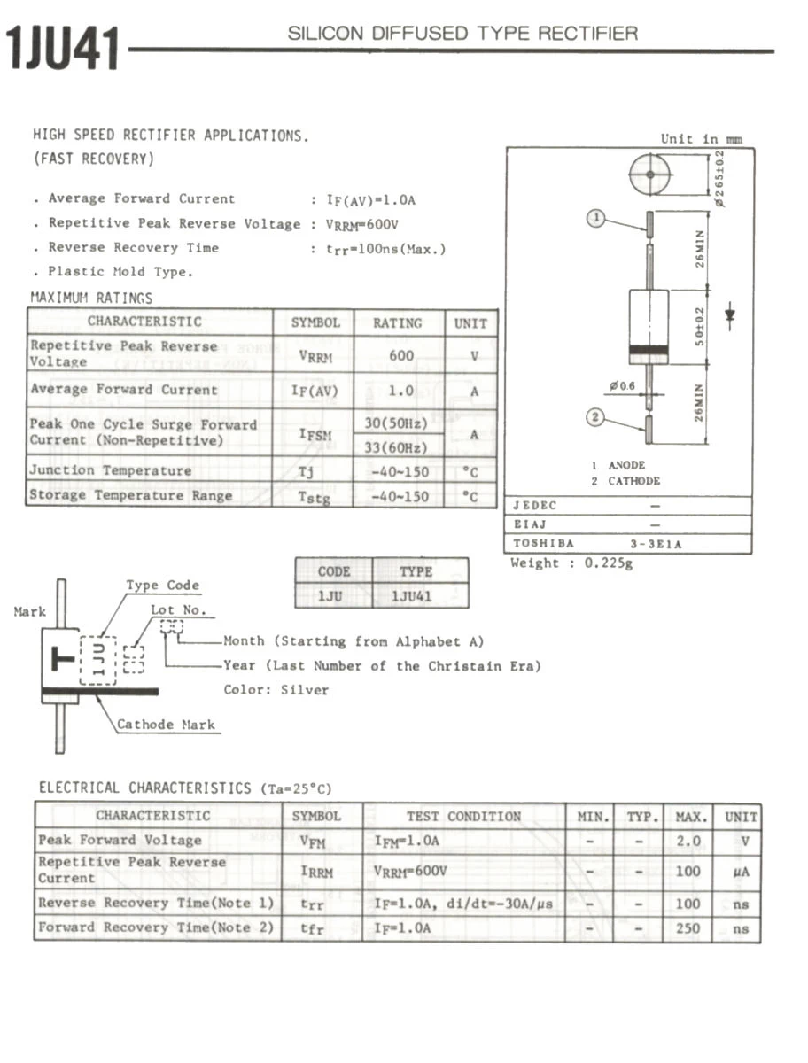 the 1JU41 is a silicon diode, U = 600V, I = 1A, applications: fast rectifier
