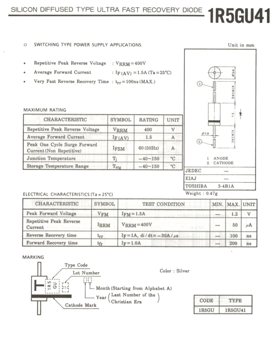 die 1R5GU41 ist eine Silizium Diode, U = 400V, I = 1.5A, Anwend: Schaltnetzteile