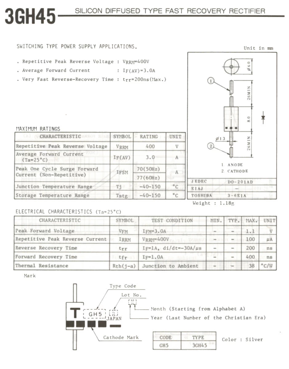 the 3GH45 is a silicon diode, U = 400V, I = 3A, applications: SMPS