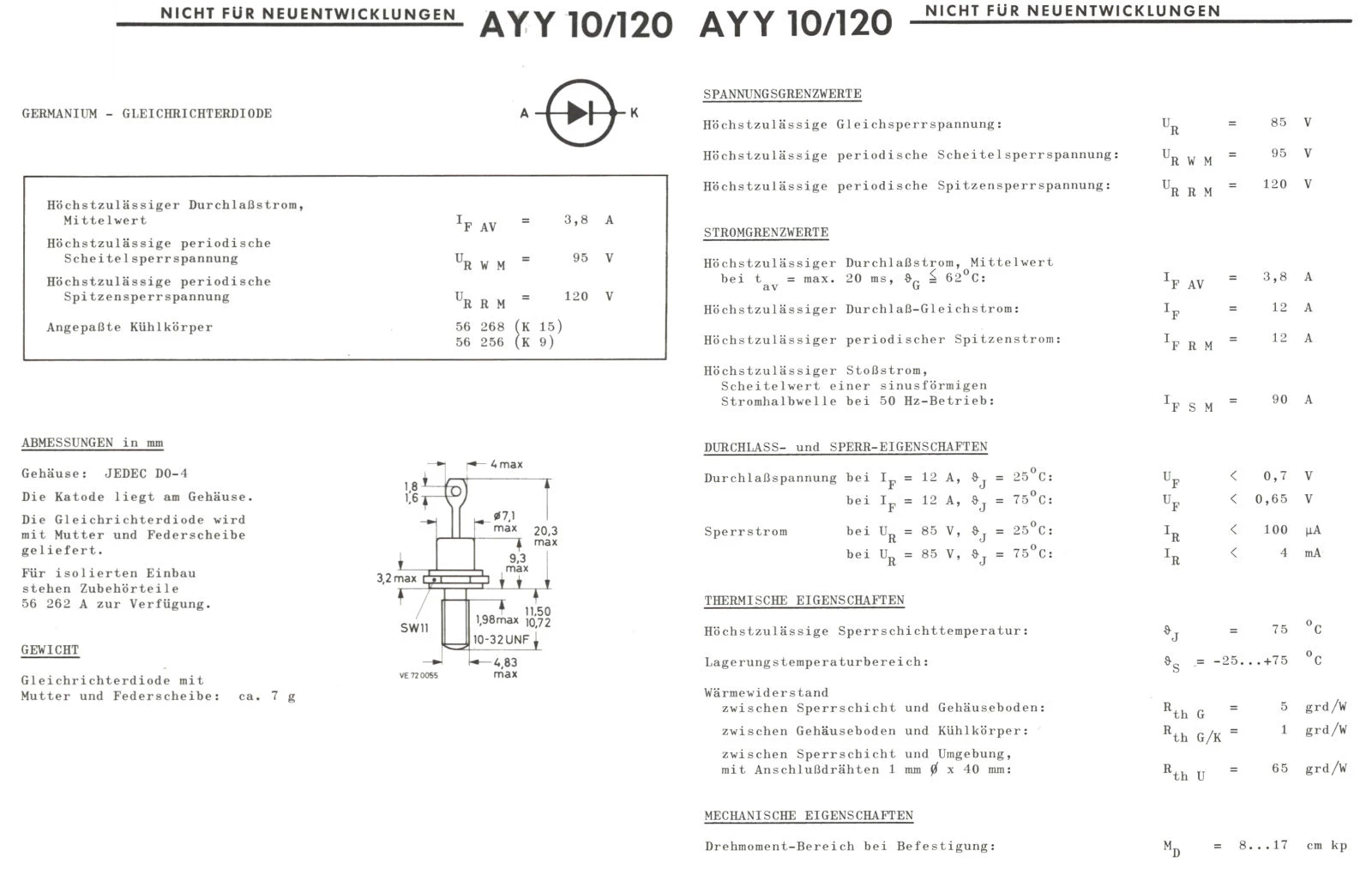 die AYY10/120 ist eine Germanium Diode, U = 85V, I = 3.8A, Anwend: Leistungsgleichrichter