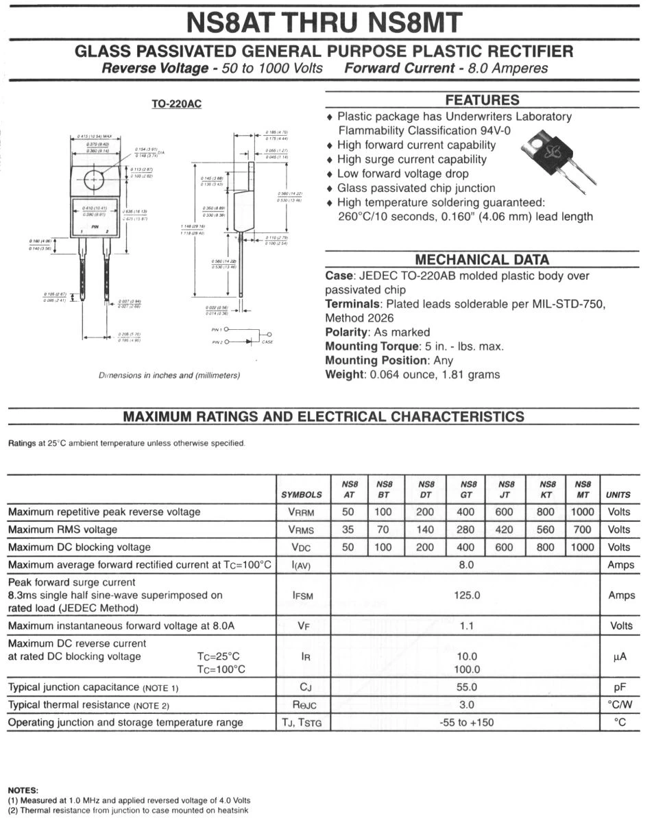 die NS8GT ist eine Silizium Diode, U = 400V, I = 8A, Anwend: Universaltyp, Gleichrichter