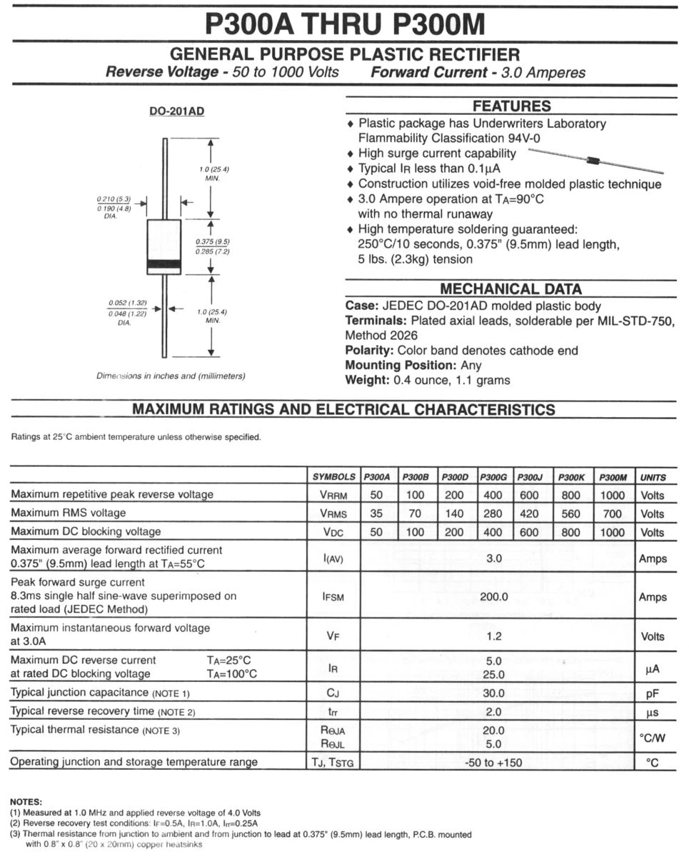 the P300B is a silicon diode, U = 100V, I = 3A, applications: general purpose, rectifier