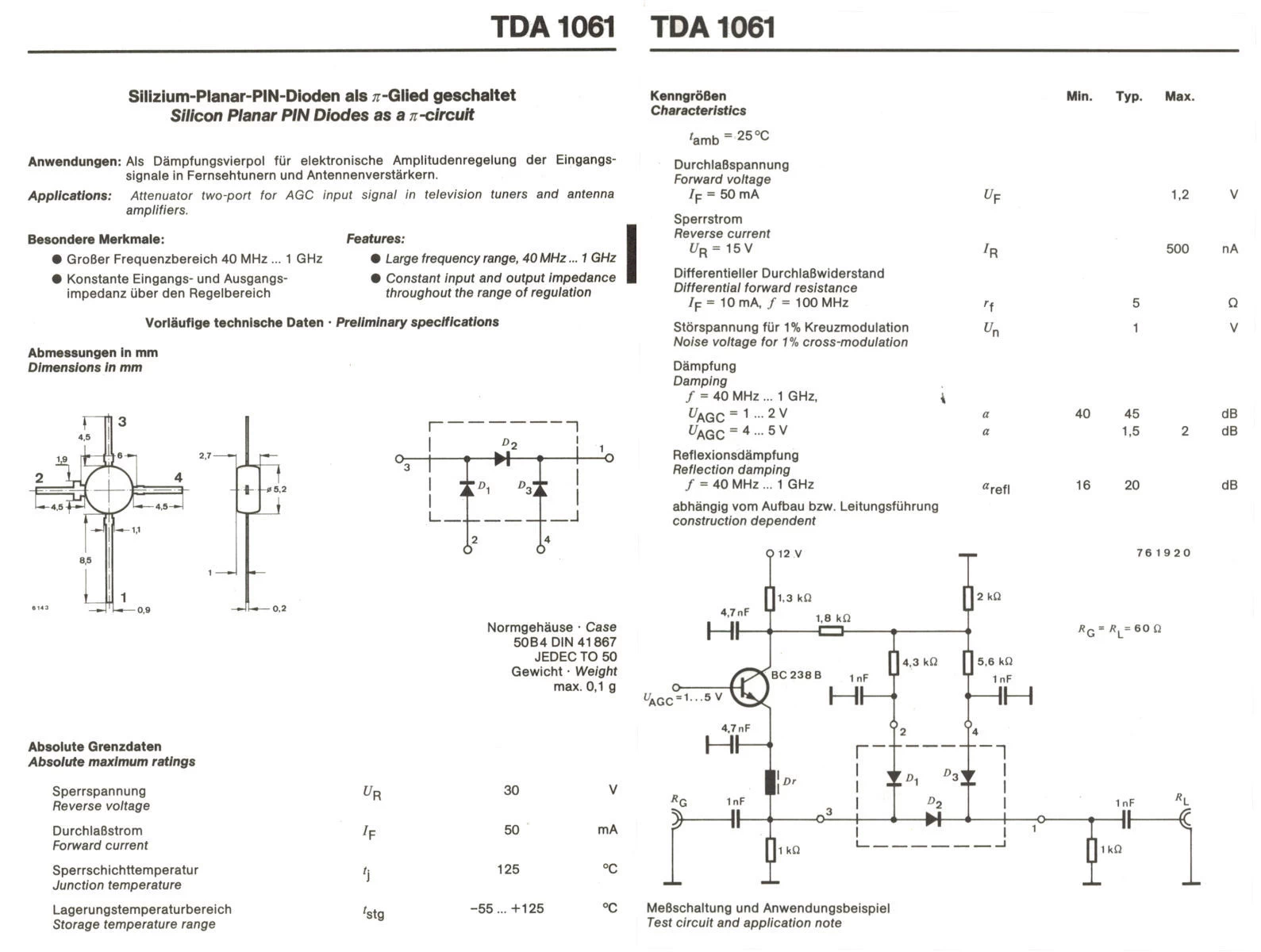 the TDA1061 is a triple silicon planar pin diode preferred for use as attentuator two port for AGC input signals in TV tuners and antenna amplifiers