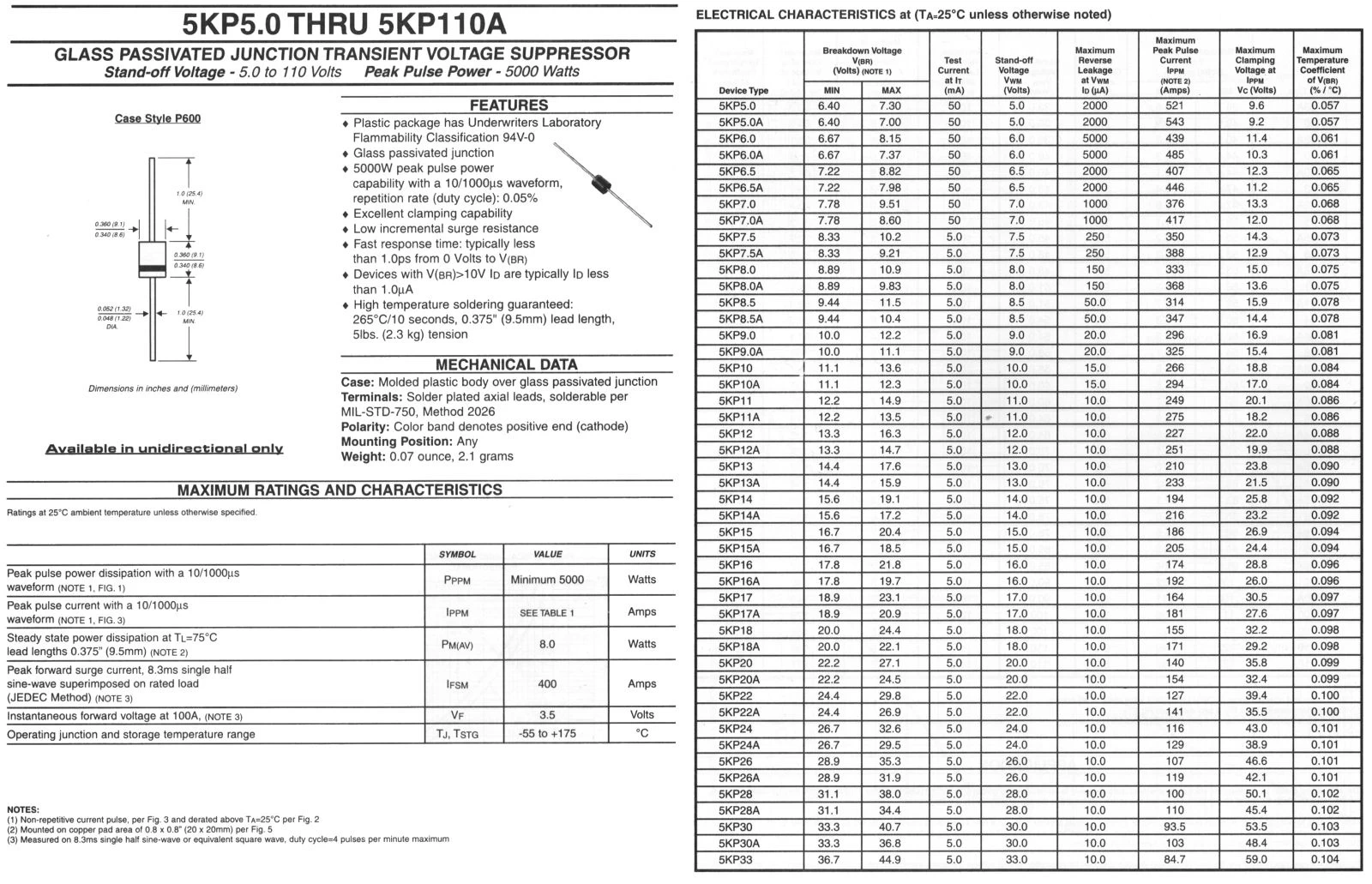 5KP5.0 è un diodo soppressore silicio, U = 9.6V, d´application: protettore di tensione, unipolare, rosso