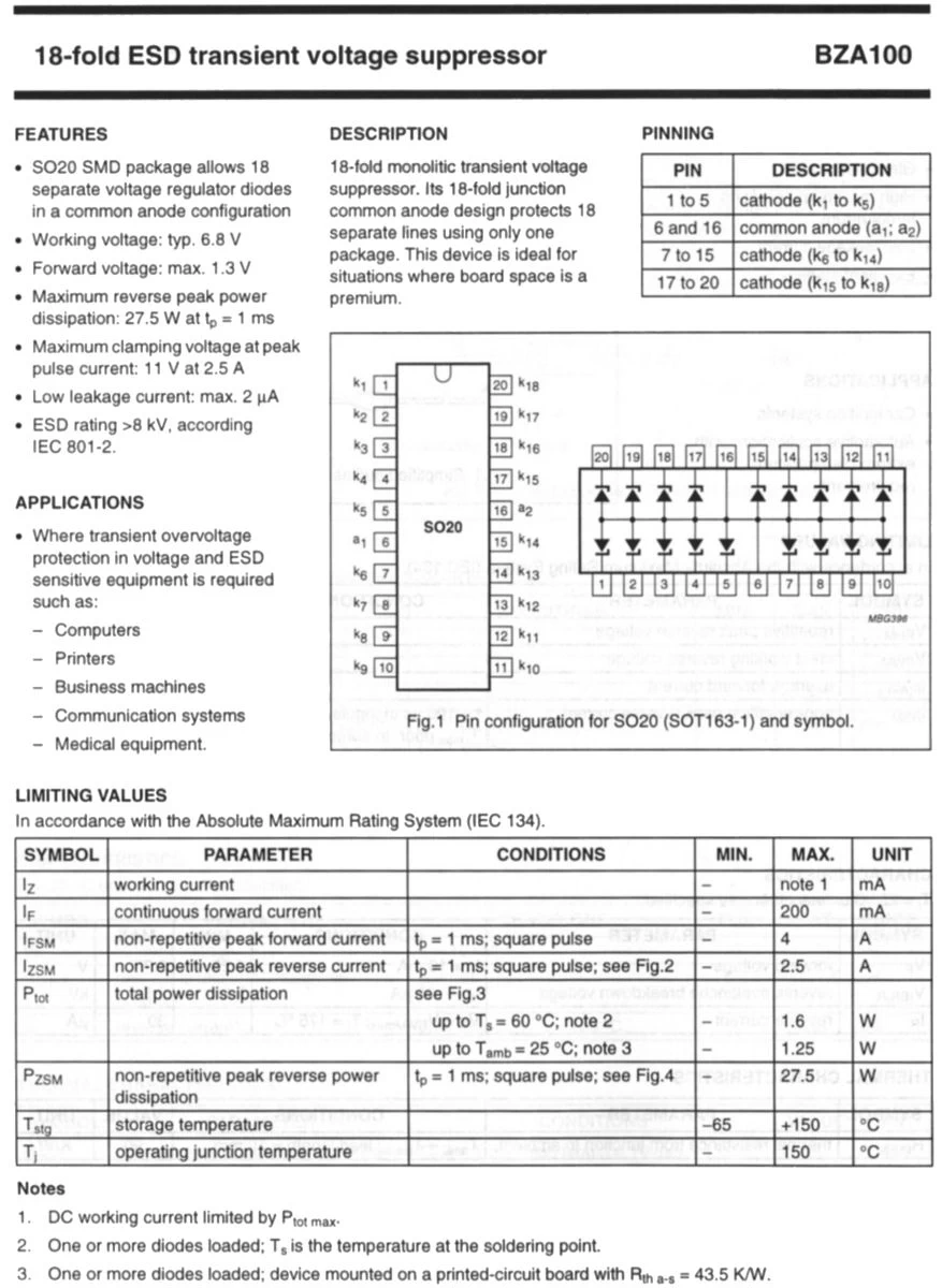 die BZA100 ist eine Silizium Suppressor- Diode, U = 6.8V, Anwend: Transient Voltage Suppressor Diode, 18- fach Diode, gemeinsame Anode