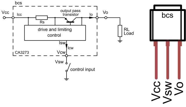 the CA3273 is a power IC equivalent of a PNP pass transistor operated as a high side driver current switch in either the saturated (ON) or cutoff (OFF) modes.