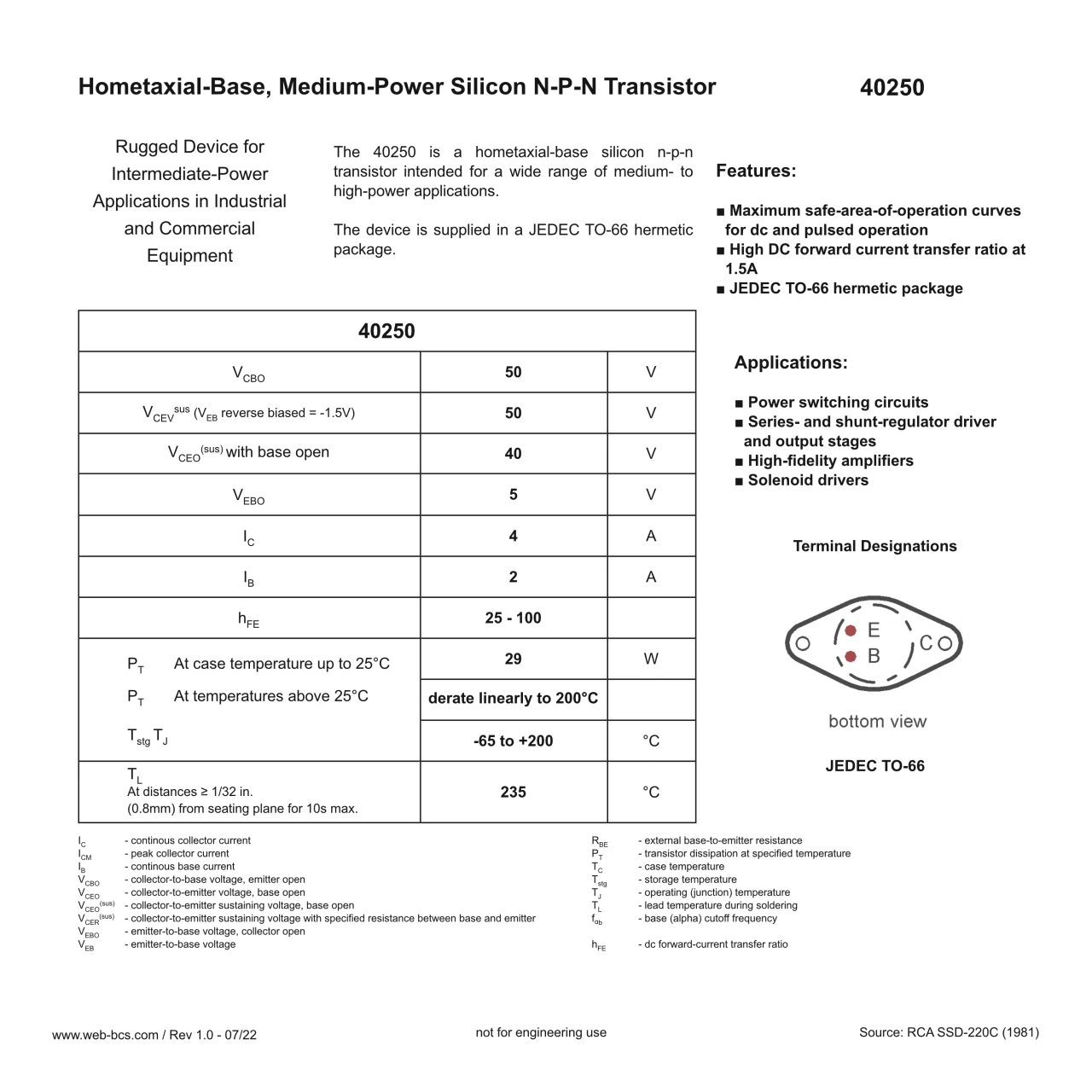 the 40250 is a silicon NPN transistor, Uce = 40V, Ic = 4A, - rugged device for intermediate power applications in industrial and commercial equipment