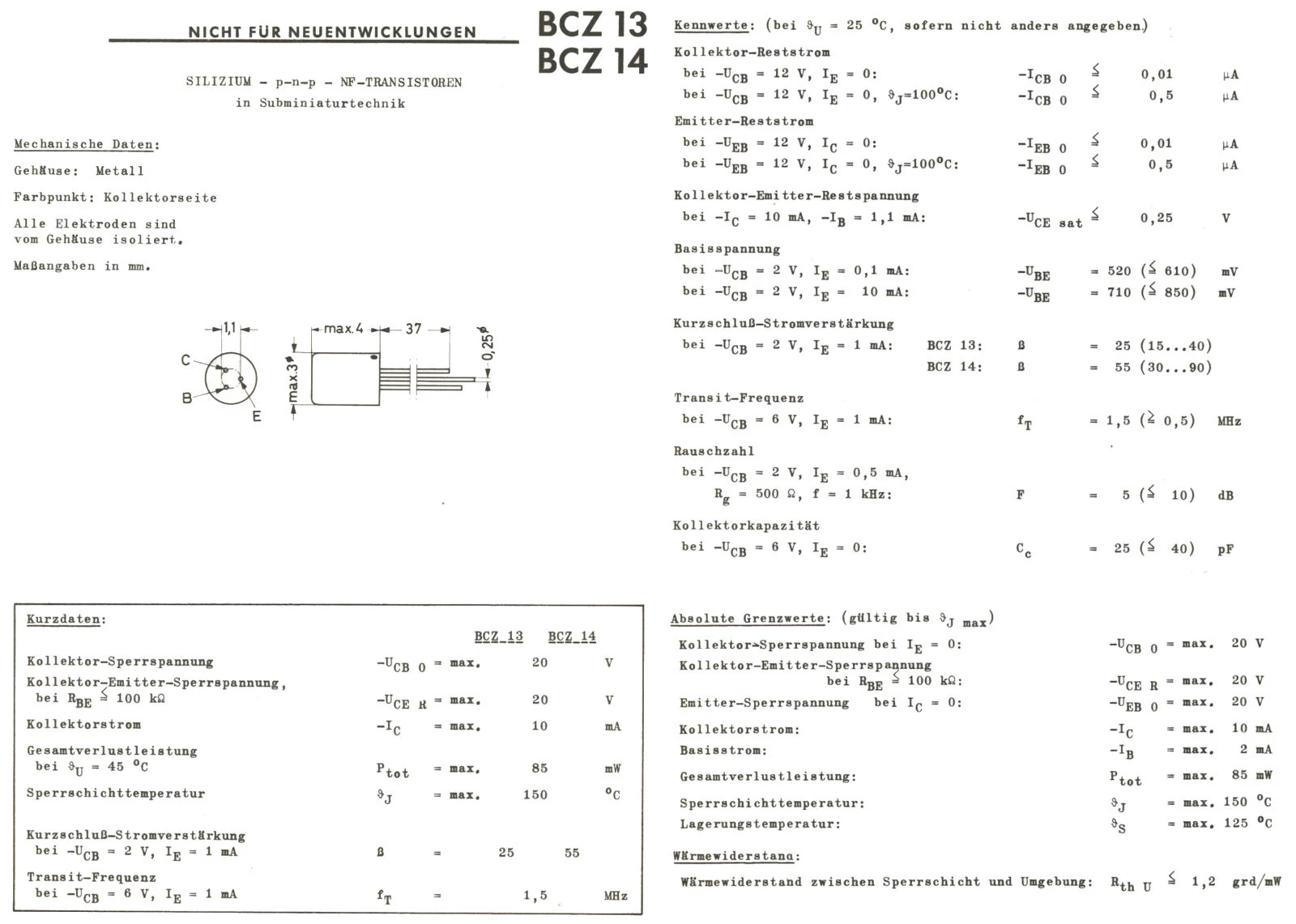 the BCZ14 is a silicon PNP transistor preferred for use in subminiatur applications, collector is color marked