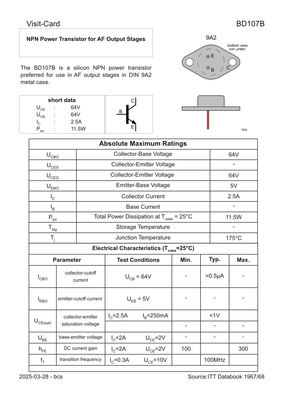 der BD107B ist ein Silizium NPN Transistor, Uce = 64V, Ic = 2.5A, Anwend: NF- Endstufen
