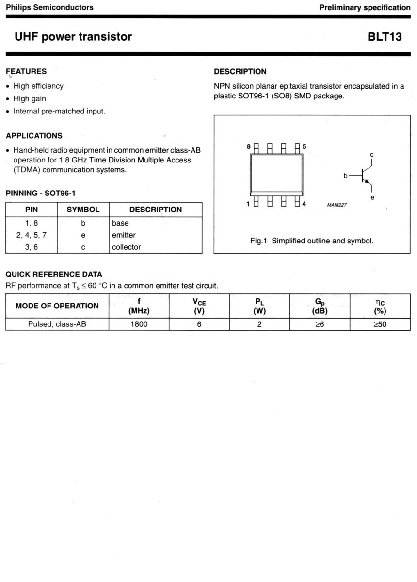 the BLT13 is a silicon NPN UHF transistor preferred for use in hand held radio applications for 1.8GHz time division multiple axis (TDMA) communication systems