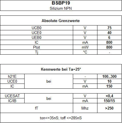 the BSBP19 is a silicon NPN transistor, Uce = 40V, Ic = 800mA, applications: switch