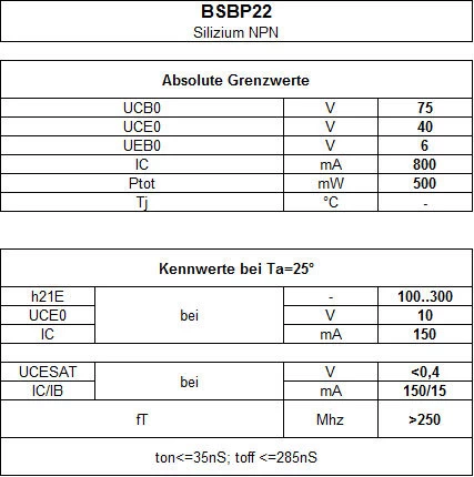 the BSBP22 is a silicon NPN transistor, Uce = 40V, Ic = 800mA, applications: switch