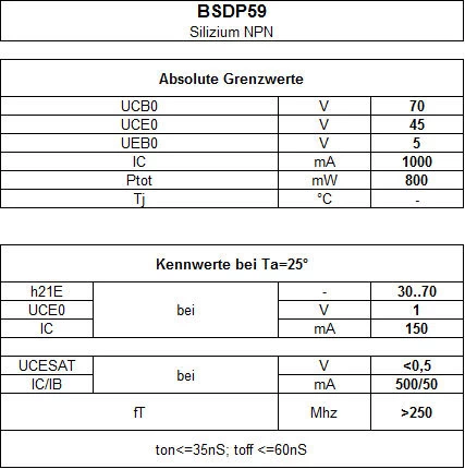the BSDP59 is a silicon NPN transistor, Uce = 45V, Ic = 1A, applications: switch