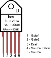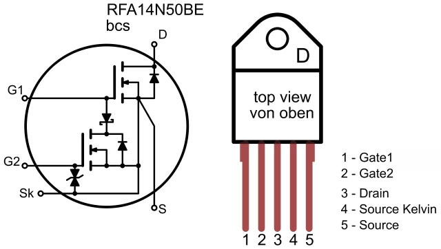 el RFA14N50BE es un transistor de silicio N-MOSFET, Uds = 500V, Ids = 14A, d´application: controlador de motor, conmutador de potencia, sistema doble